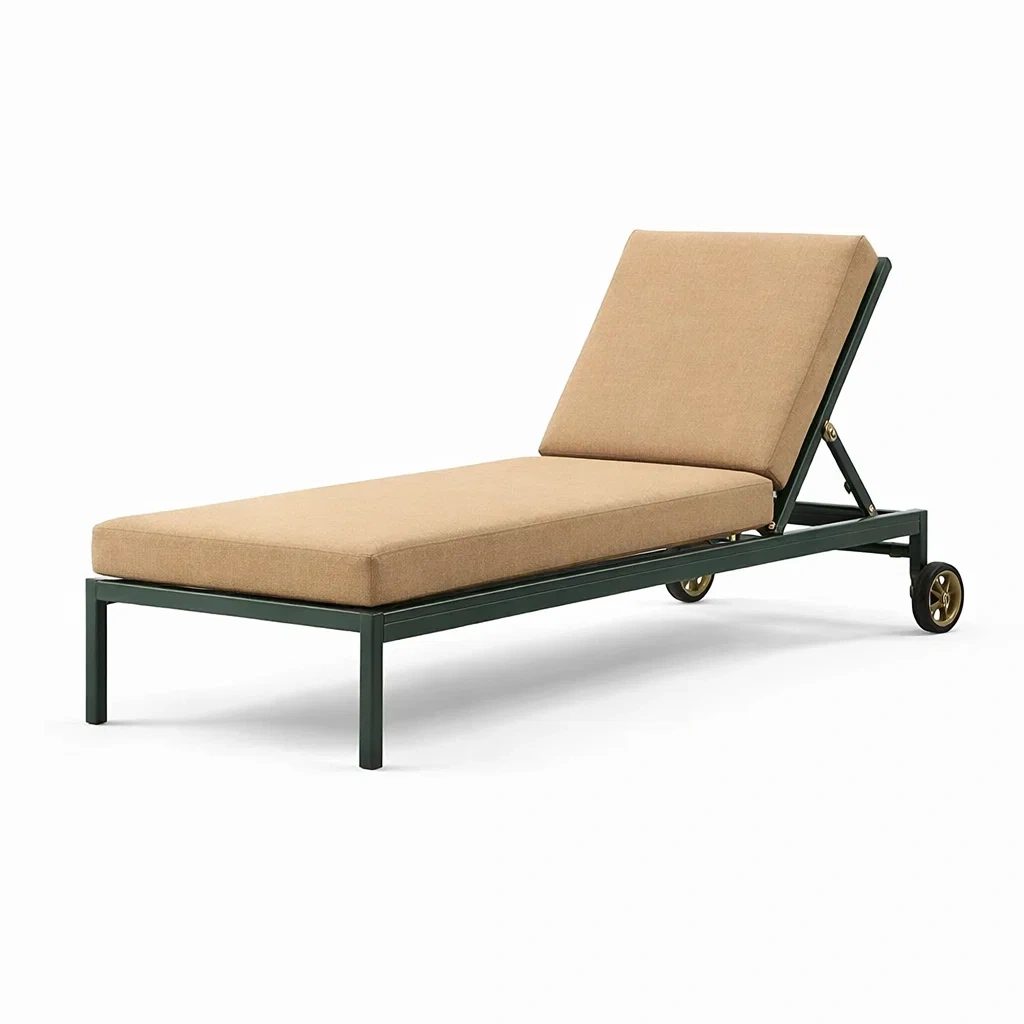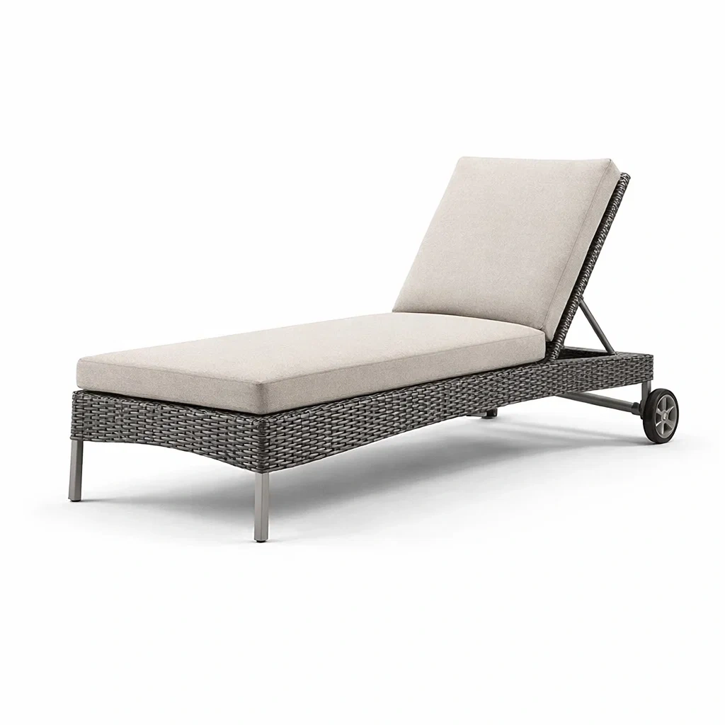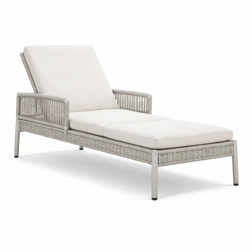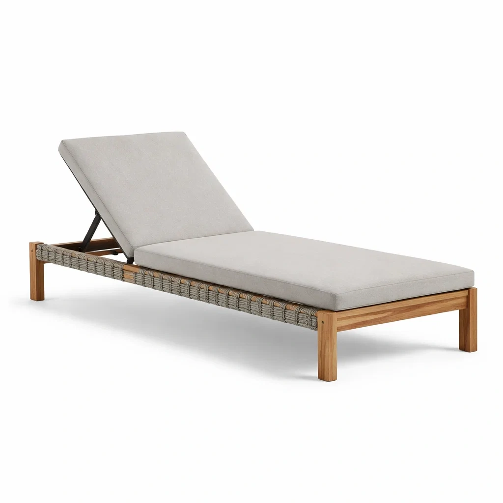 Chaise longue en aluminium avec accoudoirs en bois et coussin gris clair